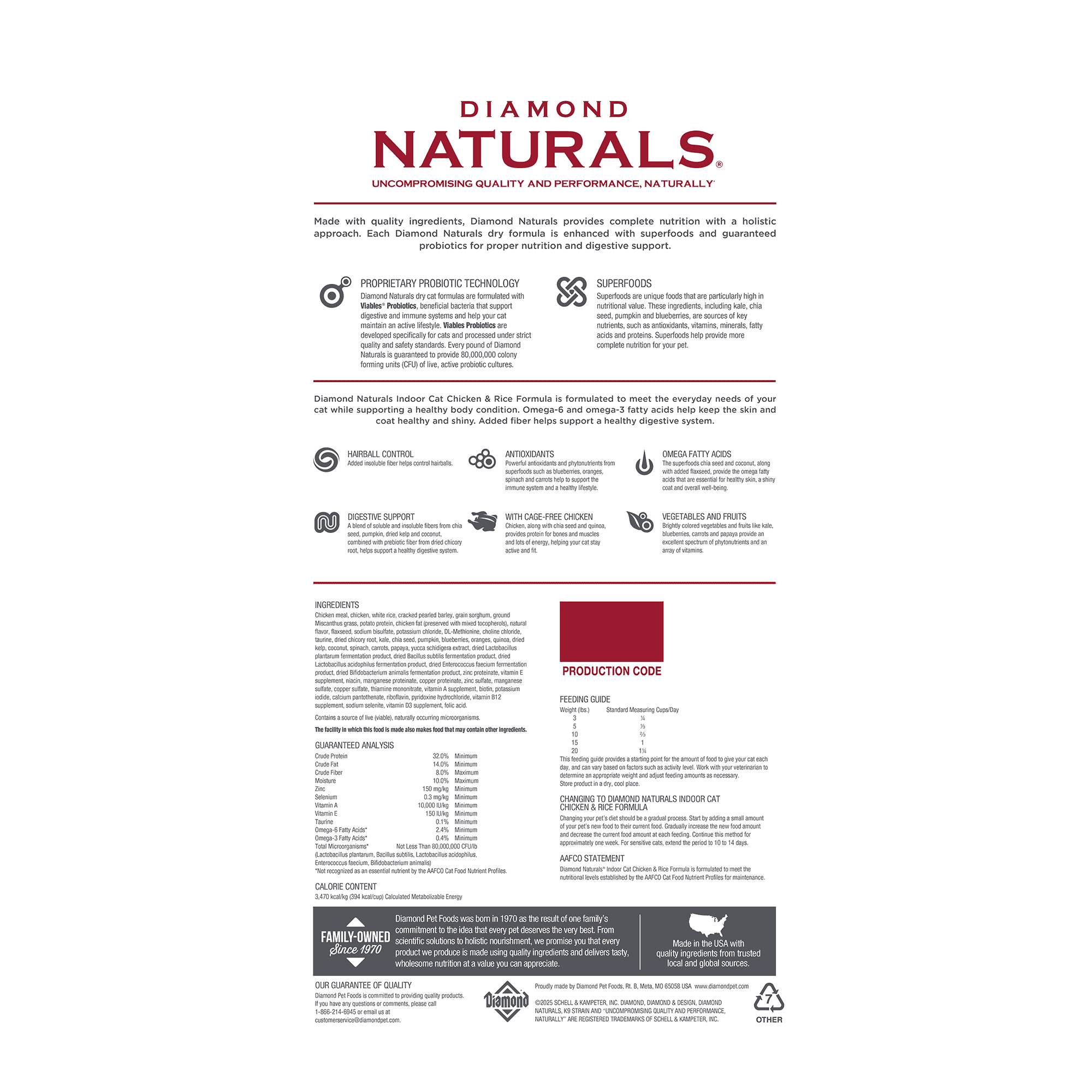 Diamond Naturals Indoor Cat Chicken & Rice Formula is formulated to meet the nutritional levels established by the AAFCO Cat Food Nutrient Profiles for maintenance.