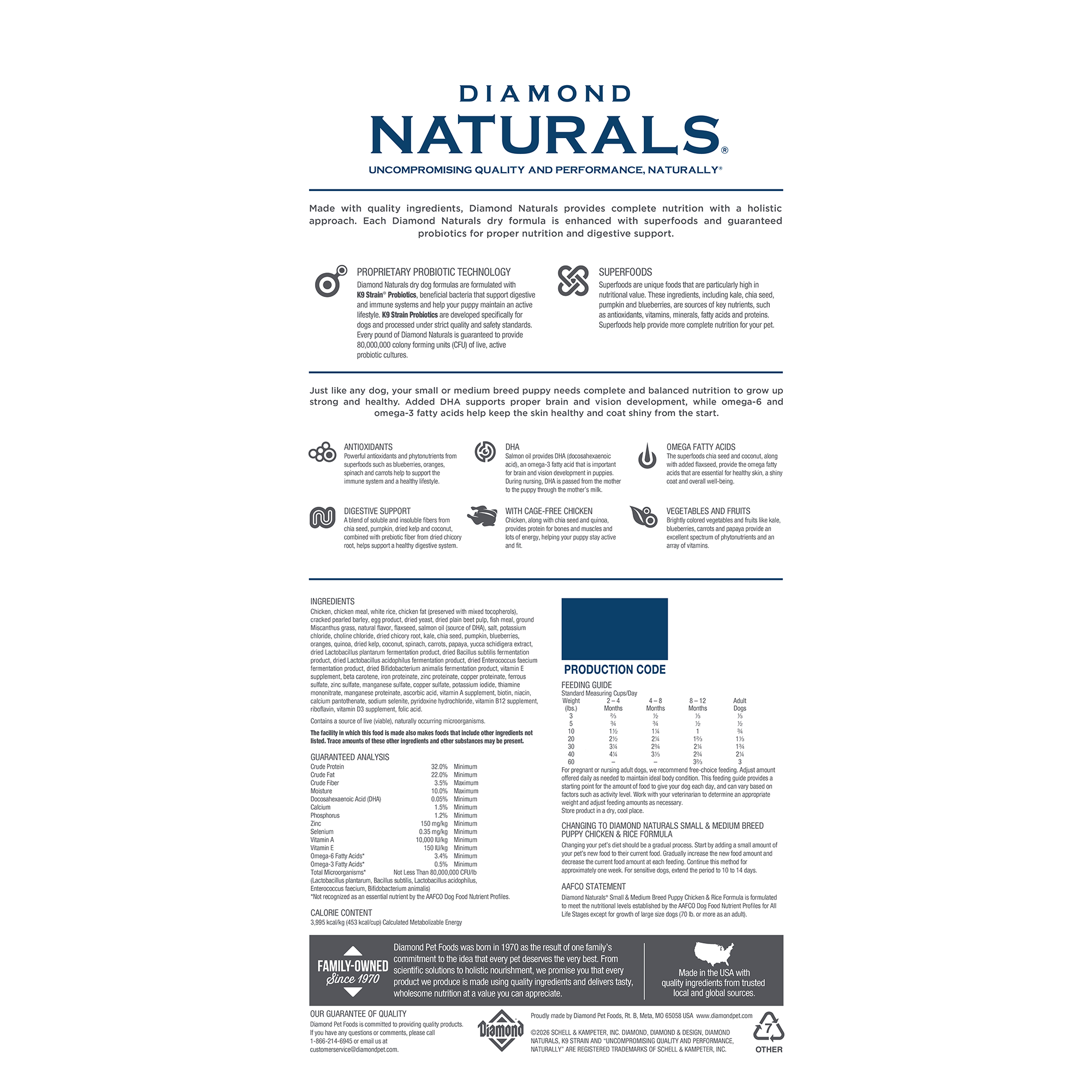 Diamond Naturals Small & Medium Breed Puppy Chicken & Rice Formula is formulated to meet the nutritional levels established by the AAFCO Dog Food Nutrient Profiles for All Life Stages except for growth of large size dogs (70 lb. or more as an adult).